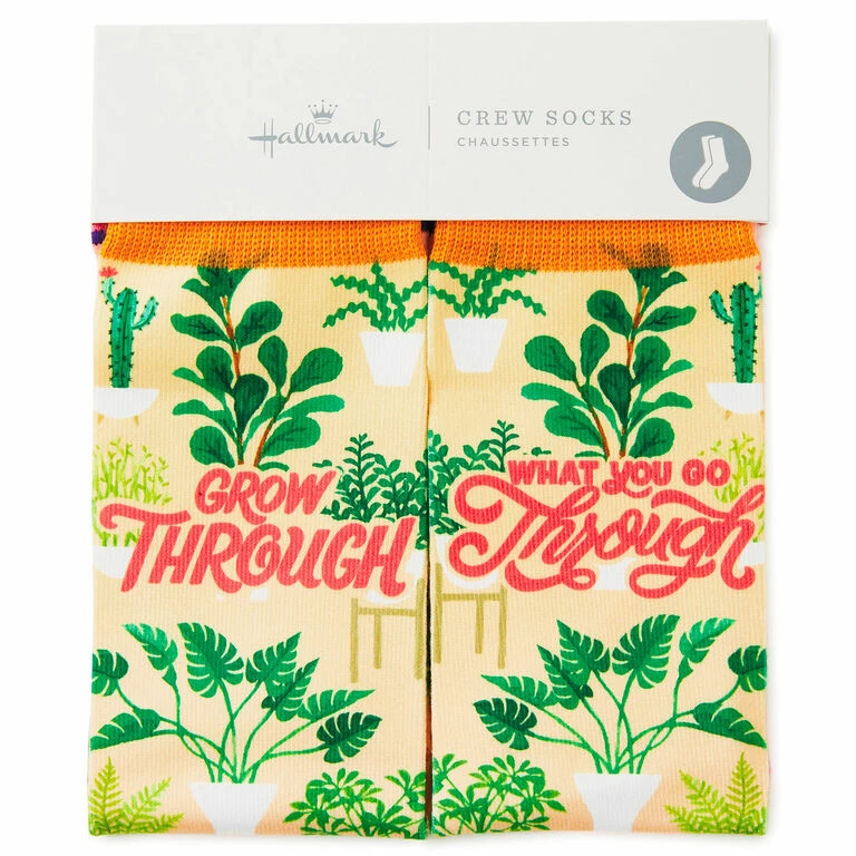 - Novelty crew socks feature illustrations of plants with an encouraging message.