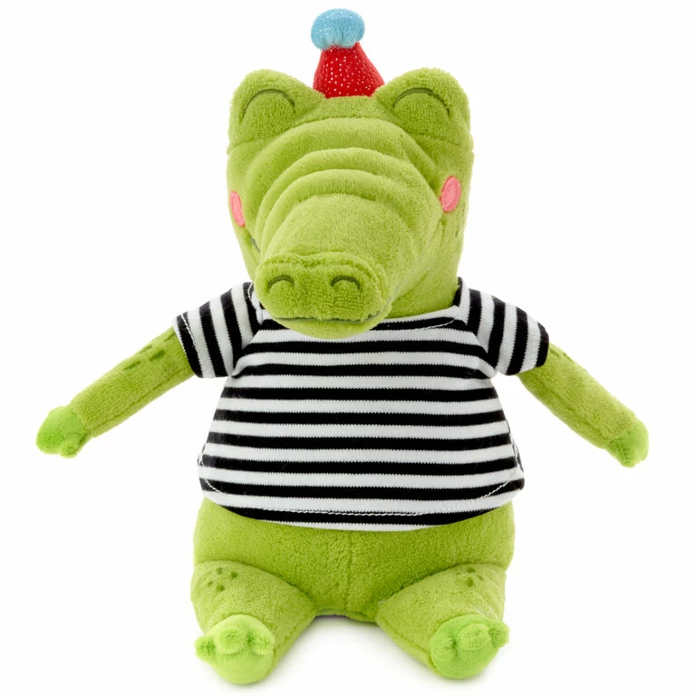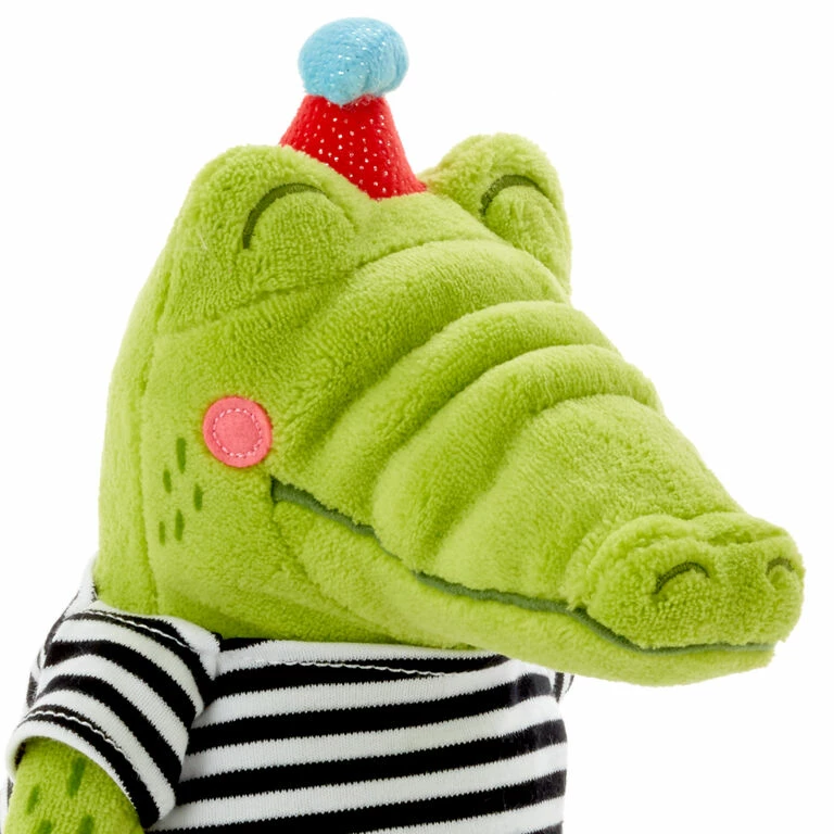 Celebrate a special child on their birthday—or any day—when you give them this super soft and cuddly alligator stuffed animal. Featuring floppy legs, a striped t-shirt and a red party hat with silver foil dots and a pom topper, this green gator plush also coordinates with our “Happy Birthday to You!” Recordable Storybook (sold separately).