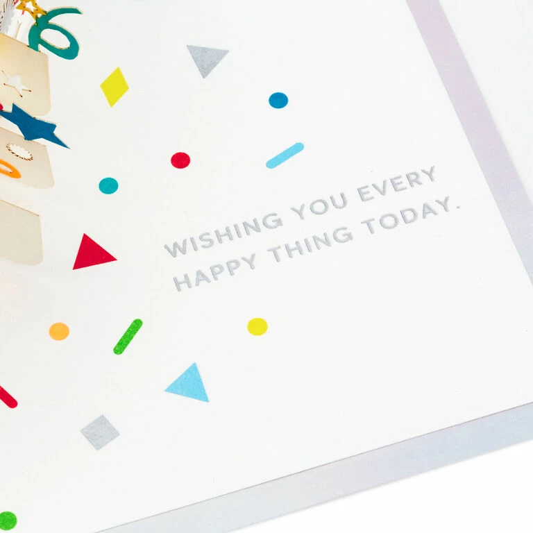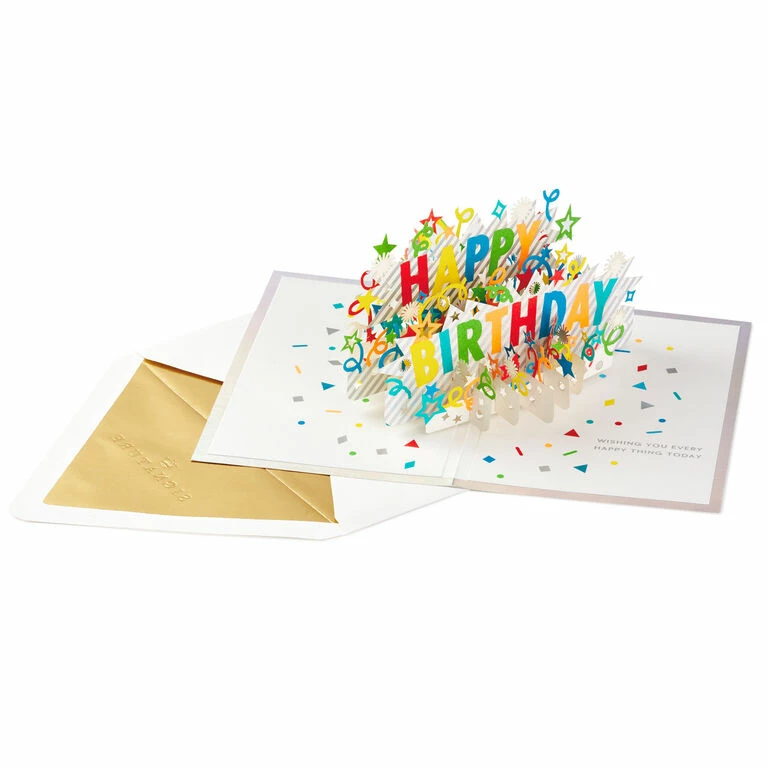 Pop-up birthday greeting card features cheerful stripes with a metallic silver foil birthday cake and “happy birthday” message on the front. Simply open the card to reveal the 3D pop-up surprise inside—no assembly required: intricate layers of colorful laser-cut stars, streamers, confetti and happy birthday wishes accented with sparkly glitter and shimmering silver foil pops out. This fun birthday card crafted from premium card stock is a work of art sure to be displayed all year long, making it an unforgettable way to wish a special kid, friend or family member a very happy birthday. When open, this pop-up card lays flat for display; 3D pop-up inside measures approx. 3.5″ H.