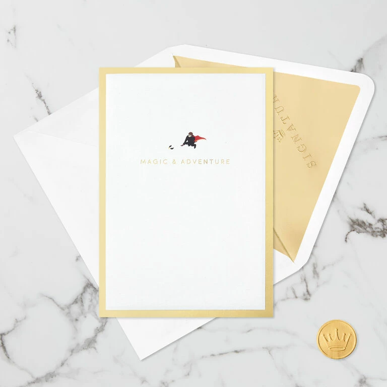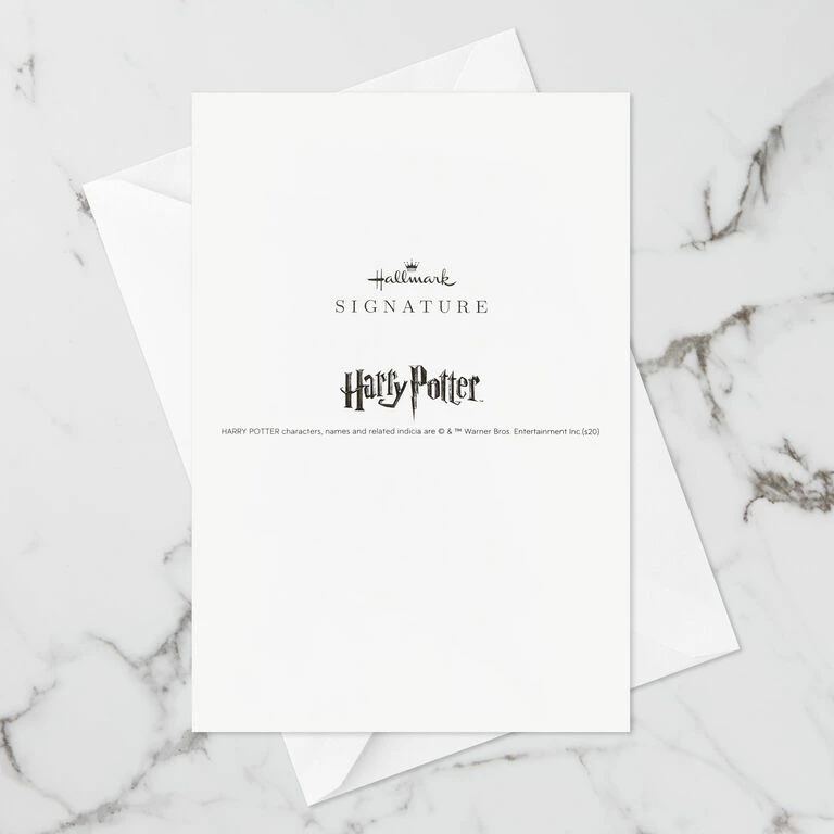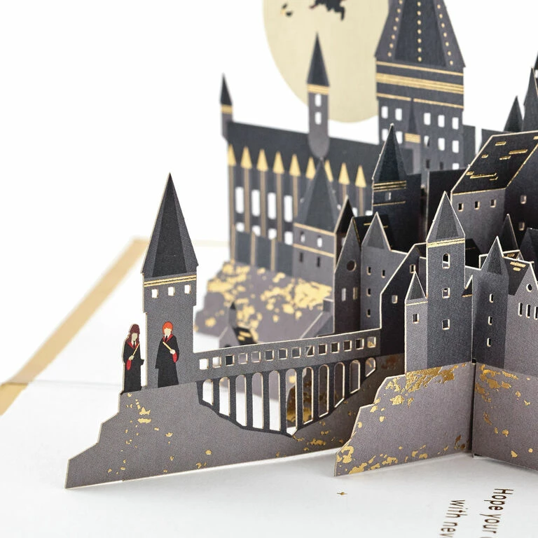 Pop-up greeting card features Harry Potter and the Golden Snitch in flight with a gold foil border and a “Magic & Adventure” message on the front. Simply open the card to reveal the 3D pop-up surprise inside—no assembly required: an intricate, laser-cut Hogwarts Castle pops out with Ron, Hermione and other favorite characters at the base while Harry pursues the Golden Snitch highlighted against a die-cut moon. Shimmering gold foil accents add to the fun. This exquisitely detailed card crafted from premium card stock is a work of art sure to be displayed all year long, making it an unforgettable way to surprise any Harry Potter fan on their birthday or just because. When open, this pop-up card lays flat for display; 3D pop-up inside measures approx. 3.25″ tall.