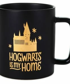 - Harry Potter black ceramic mug features Hogwarts castle design and quote in metallic gold.