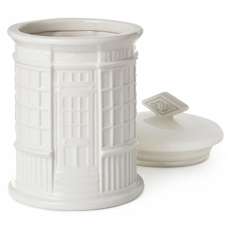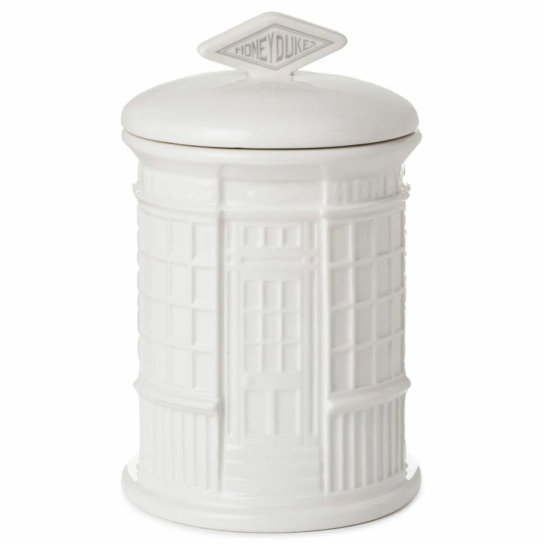 - Harry Potter ceramic treat jar with lid features Honeydukes Sweet Shop design.