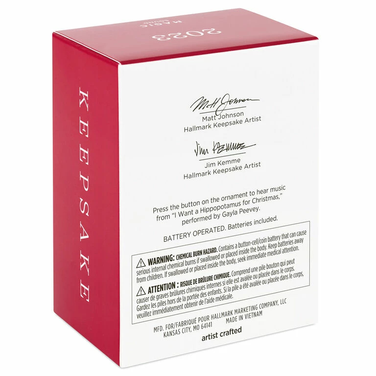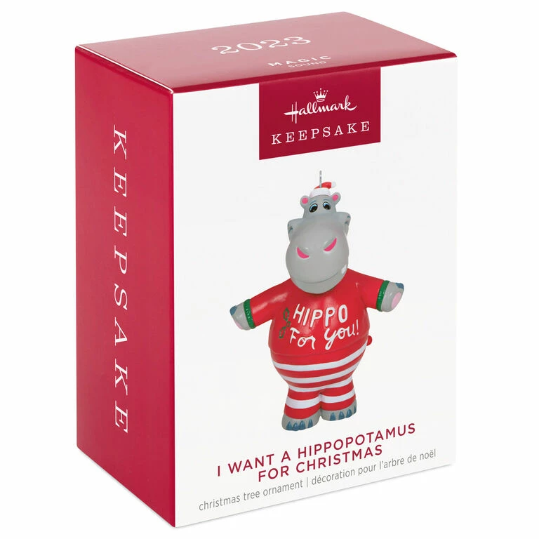 - Key Features: Press the button on the Magic Sound ornament to hear music from “I Want a Hippopotamus for Christmas” performed by Gayla Peevey.