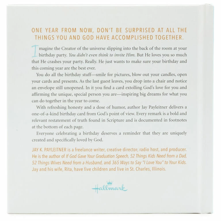Imagine a birthday card God crafted especially for you! This uplifting book gives an idea just how that birthday card might read. Share a message of love and compassion with this fun hardcover book that will wrap the birthday person in warmth on their birthday and all through the year. Pretty stripe and dot designs set off loving thoughts paired with appropriate Bible scripture verses for a read that will deepen their faith and broaden their joy.