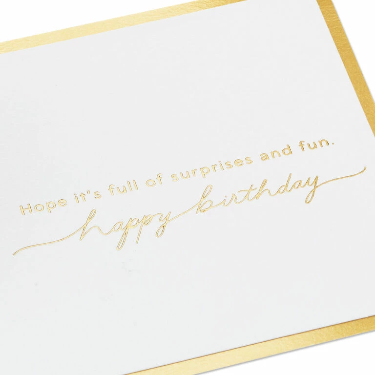 Pop-up birthday greeting card features a party hat with gold foil accents paired with a celebratory message and gold foil border on the front. Simply open the card to reveal the 3D pop-up surprise inside—no assembly required: an intricate, laser-cut scene of a cute puppy dog sitting inside of a present with colorful balloons, a “happy birthday” banner and other gift packages pops out. Gold foil accents add a festive touch to the inside of the card. This fun greeting crafted from premium card stock is a work of art sure to be displayed all year long, making it an unforgettable way to share happy birthday wishes with kids, friends or family members. When open, card lays flat for display; 3D pop-up inside measures approx. 5.5″ H.