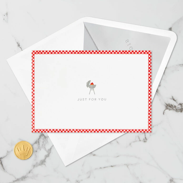 Pop-up birthday greeting card features a BBQ grill with silver foil accents and a red and white checkered tablecloth-style border on the front. Simply open the card to reveal the 3D pop-up surprise inside—no assembly required: an intricate, laser-cut scene featuring a lit BBQ grill and outdoor cooking accessories pops out. Silver foil accents add a shiny and shimmery touch to the inside of the card. This festive greeting crafted from premium card stock is a work of art sure to be displayed, making it an unforgettable way to share birthday wishes with someone special. When open, card lays flat for display; 3D pop-up inside measures approx. 5.75″ H.