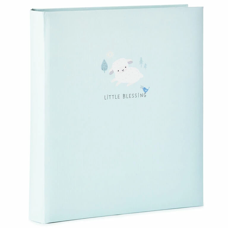 - Hardcover three-ring binder baby book features sweet lamb design on cover.