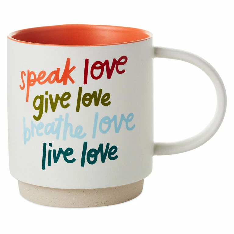 Start your day with inspiration and uplifting thoughts when you sip your morning brew from this ceramic mug that shares a message that’s all about love. Multicolored lettering on white and an orange interior add a fun and whimsical touch. Makes a great gift for a coffee-loving friend!