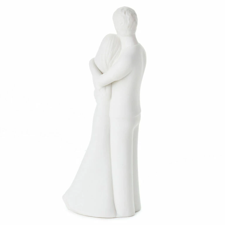 - Porcelain figurine by artist Joanne Wright features a man and woman embracing, with etched details and gold ink lettering.
