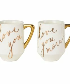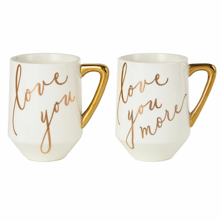 Share the love with this sweet pair of coordinating mugs for the newlyweds or soon-to-be-married pair. Flirty messages of love stand out in elegant gold script against a cream background. Gold handles add a fancy touch.
