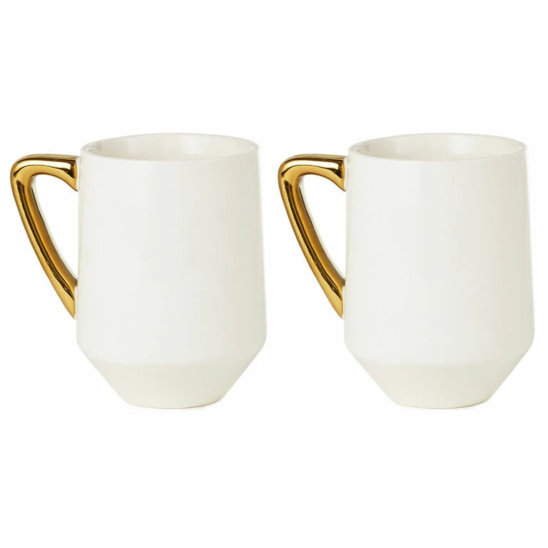 - Set of 2 white ceramic mugs features shiny gold design and coordinating messages.