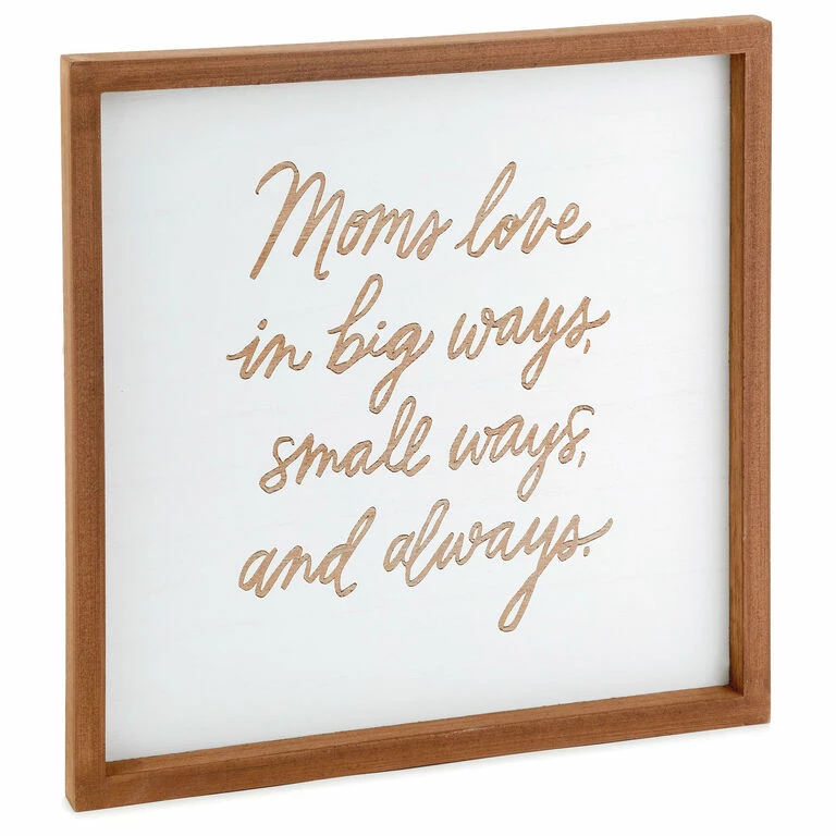 Show your appreciation for the kind of unconditional love that only a mom can give. This wood framed quote sign features an etched script message on a white-painted wood background. Celebrate mom with this sign she can hang on a wall in her home or office. Wood sign makes a perfect gift for Mother’s Day or her birthday.