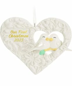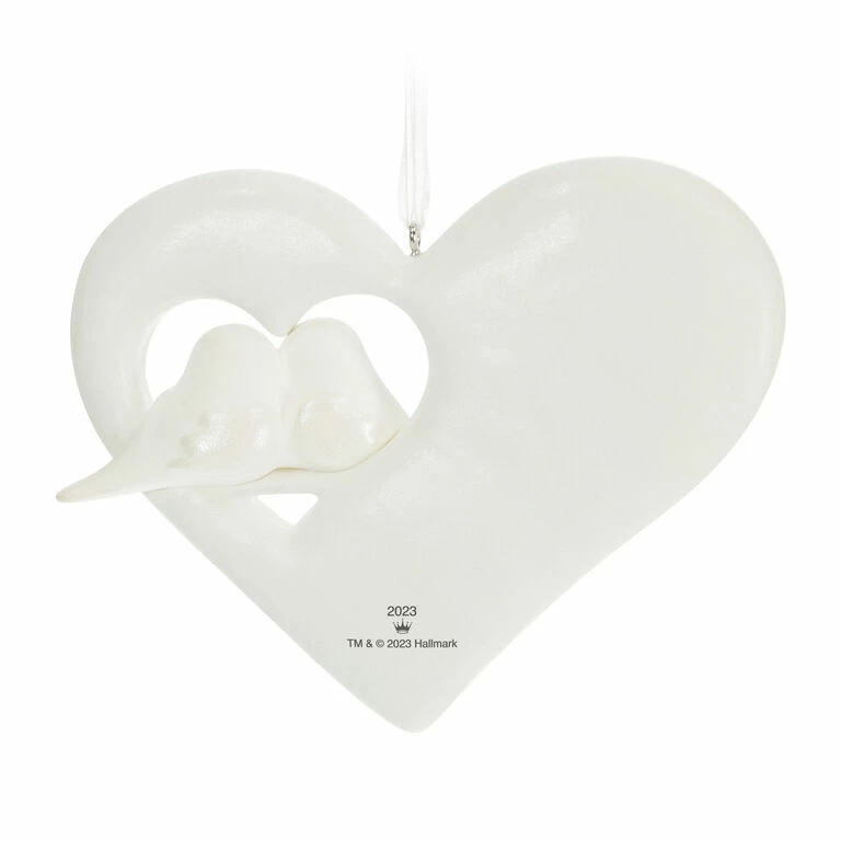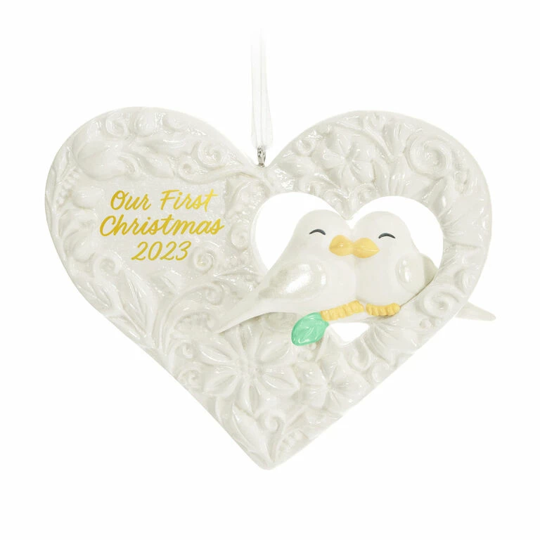 Give them a gift to have and to hold for years to come. This beautiful porcelain heart Christmas tree ornament features ornate embossed detailing with a pair of white doves perched in a heart-shaped opening. Year-dated 2023, it’s an especially lovely keepsake for newlyweds or any new couple.