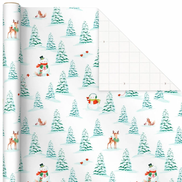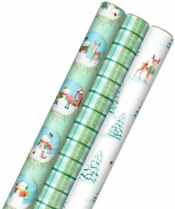 - Pack includes 3 wrapping paper rolls in coordinating Christmas designs: snowmen scenes, green plaid and snowy forest.