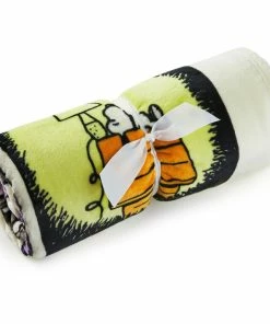 Cozy up while watching your favorite scary Halloween flicks under this cute Peanuts comic strip blanket. Charlie Brown, Snoopy and Linus watch a frightening Frankenstein monster movie on television in this classic Peanuts comic strip. Plush throw blanket’s design pops in purple, orange, black and yellow on white.