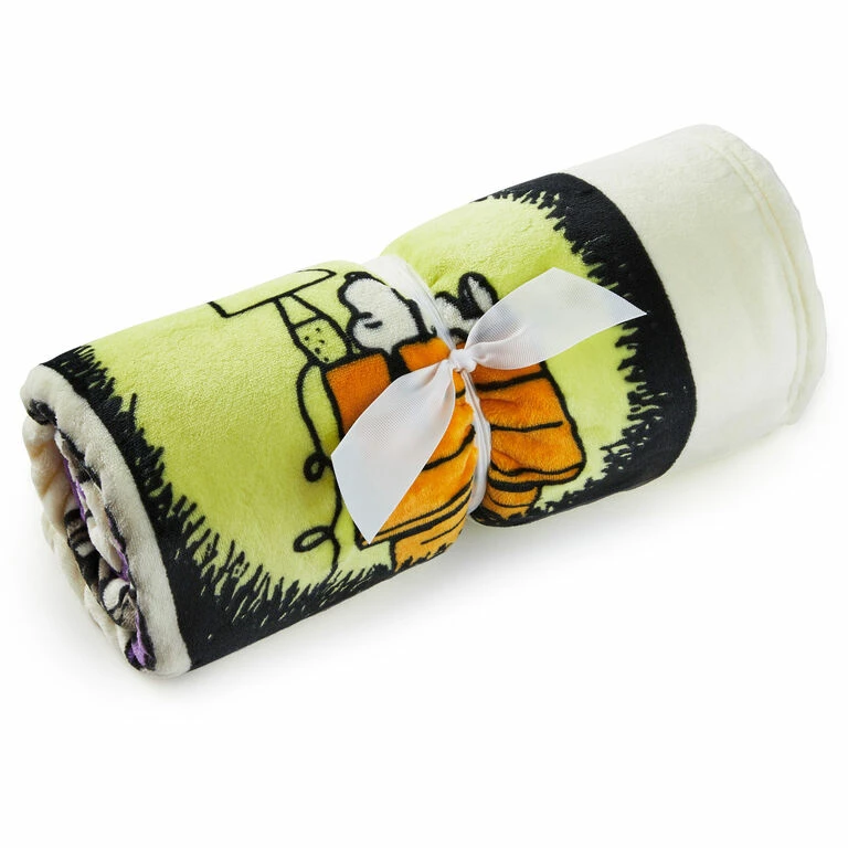 - Peanuts plush polyester throw blanket features a classic comic strip illustration of Snoopy, Charlie Brown and Linus watching a scary Frankenstein movie.