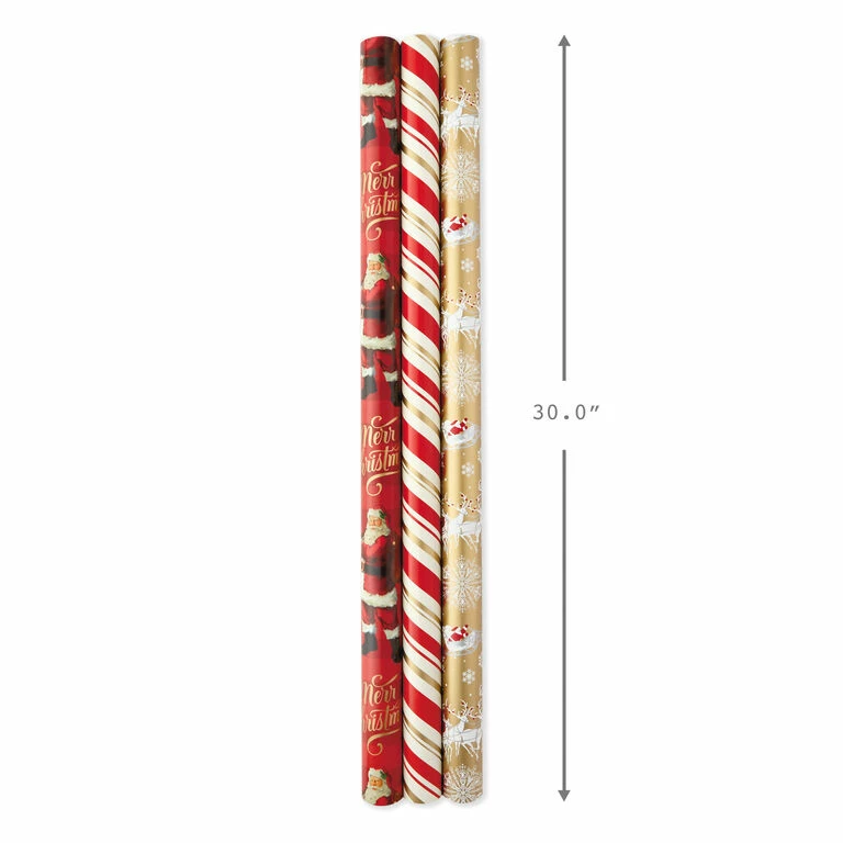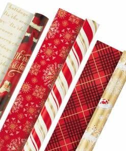 - Pack includes 3 reversible wrapping paper rolls with 6 coordinating Christmas designs and metallic ink accents: holiday messages/Santa on red, red plaid/Santa’s sleigh, snowflakes on red/diagonal stripes.