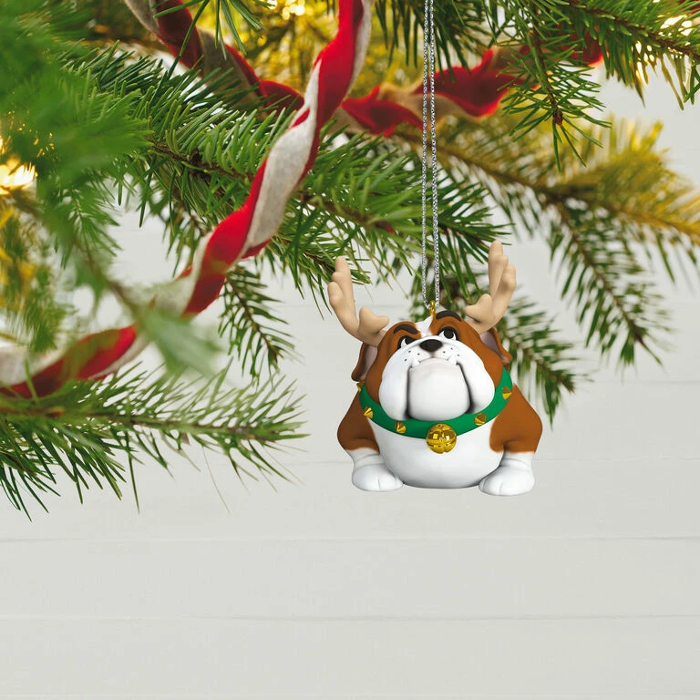 Deliver a dose of holiday whimsy with this fun Christmas tree ornament. Decked out with a stately set of reindeer antlers and a jingle bell collar, this bulldog “reindoggie” is full of holiday spirit—whether he likes it or not.