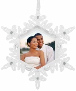 Mark an anniversary, give a romantic holiday gift, or celebrate the life of a loved one with this personalized Christmas tree ornament. This elegant, shimmering snowflake features gem accents and space to add a personal photo.