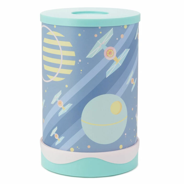 Shower a youngling or Padawan with soothing starlight with this adorable Star Wars lamp. With both “Show” and “On” modes, this tabletop light can play a lullaby or simply be used as a revolving nightlight. Simply press the button to see it rotate and light up. Cylindrical lamp features a pastel scene of the Death Star and Millennium Falcon with TIE fighter and X-Wing fighter designs and stars around the perimeter.