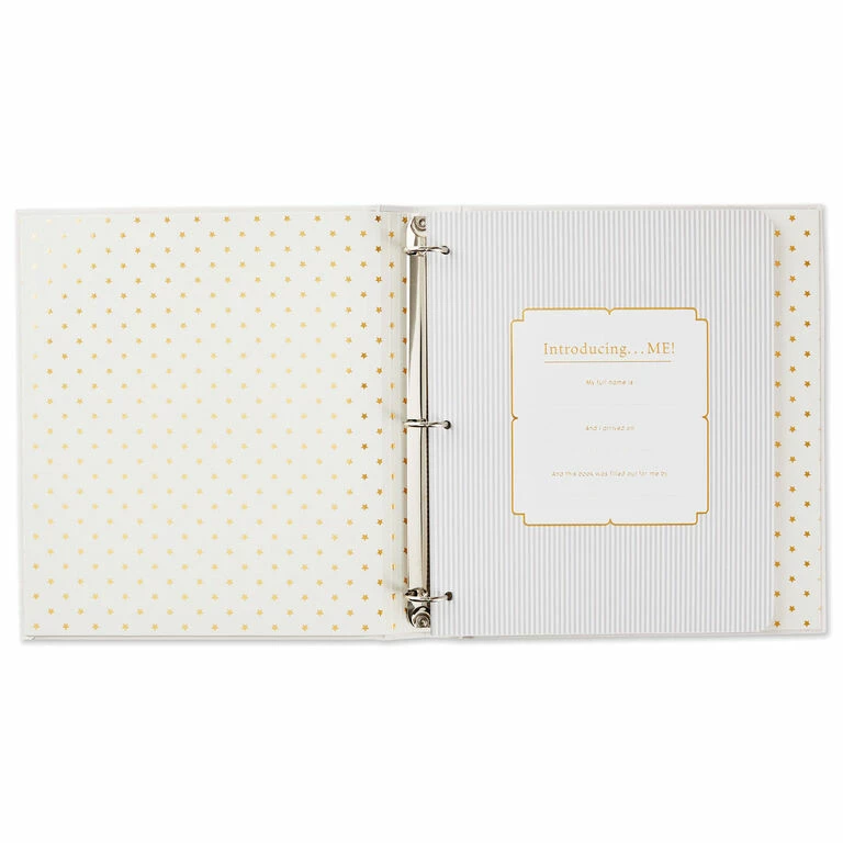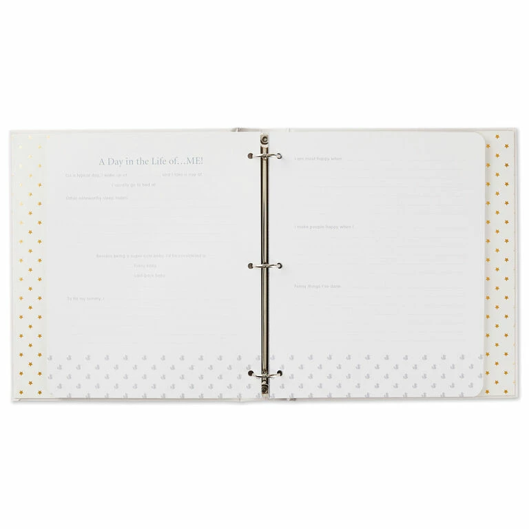 - Hardcover three-ring binder baby book features gold foil lettering and design on cover.