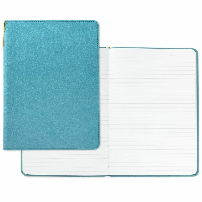 - Faux leather notebook features turquoise blue cover and includes a slim pen housed in the spine.