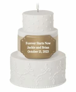 Add a special touch to your first holiday season together with this personalized Christmas tree ornament. The pretty ceramic three-tier wedding cake design features a metal accent to customize with a name, date or personal message. Makes a heartfelt bridal shower or wedding gift for newlyweds.