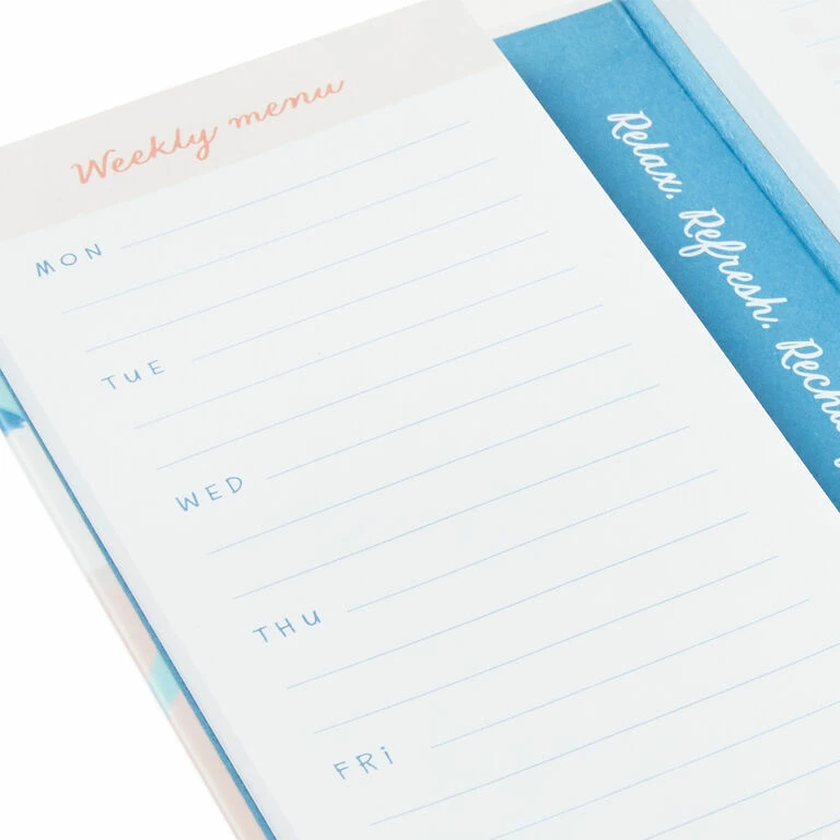Stay organized and on track when menu planning and grocery shopping with this handy set of memo pads. Open this tall and slim hardback folio to find one pad for writing down your weekly menus and another for creating a shopping list, complete with checkboxes. A printed mantra runs down the inside center gusset to renew your spirit every time you open the binder.
