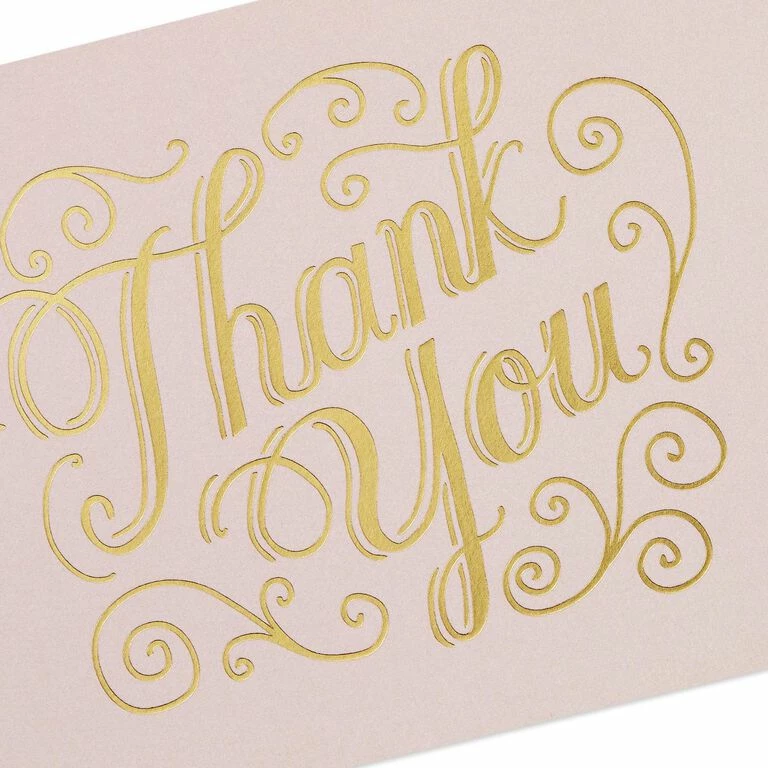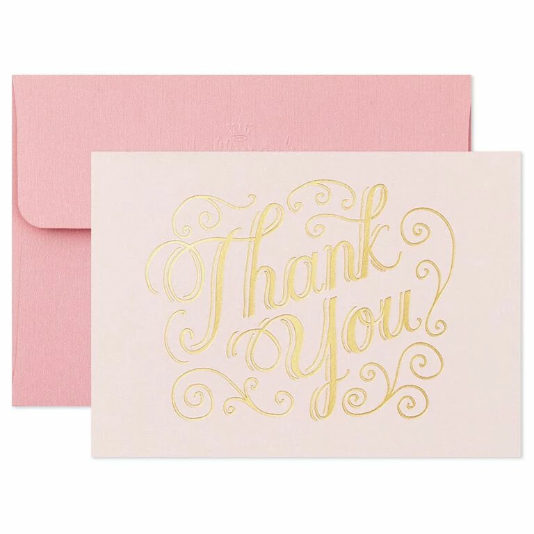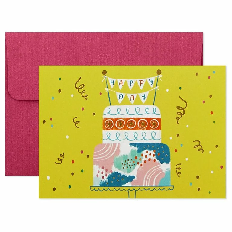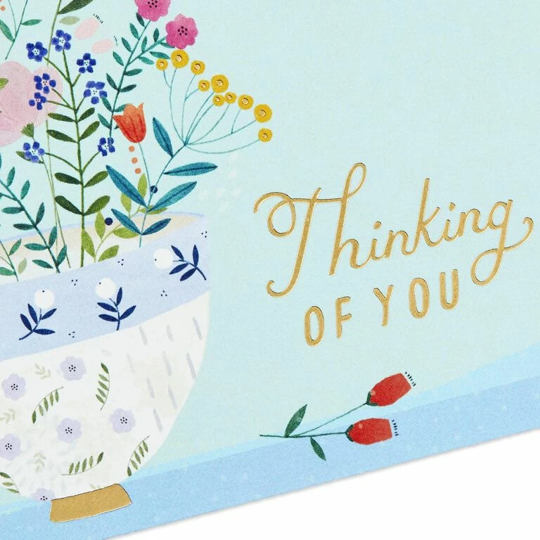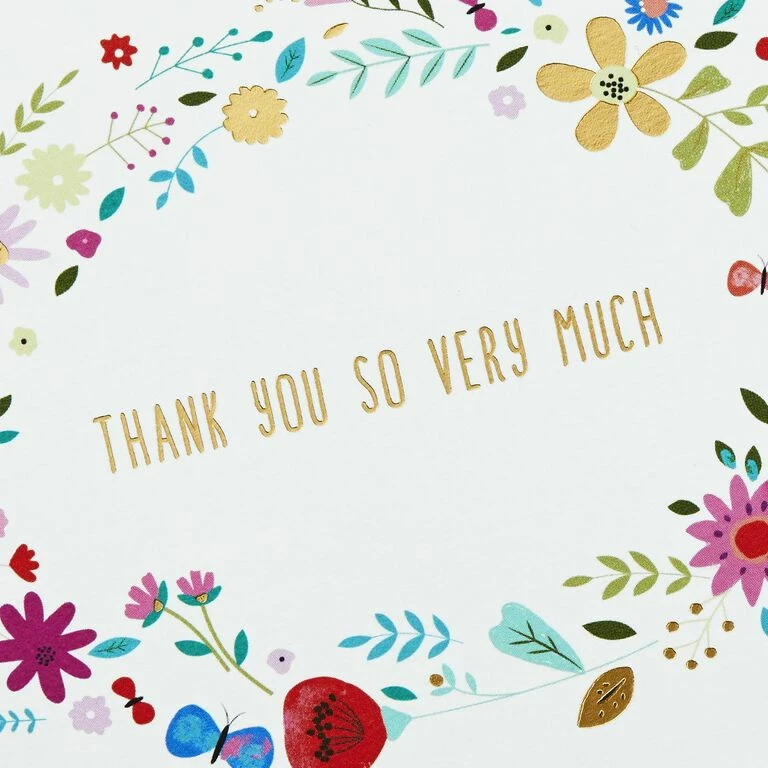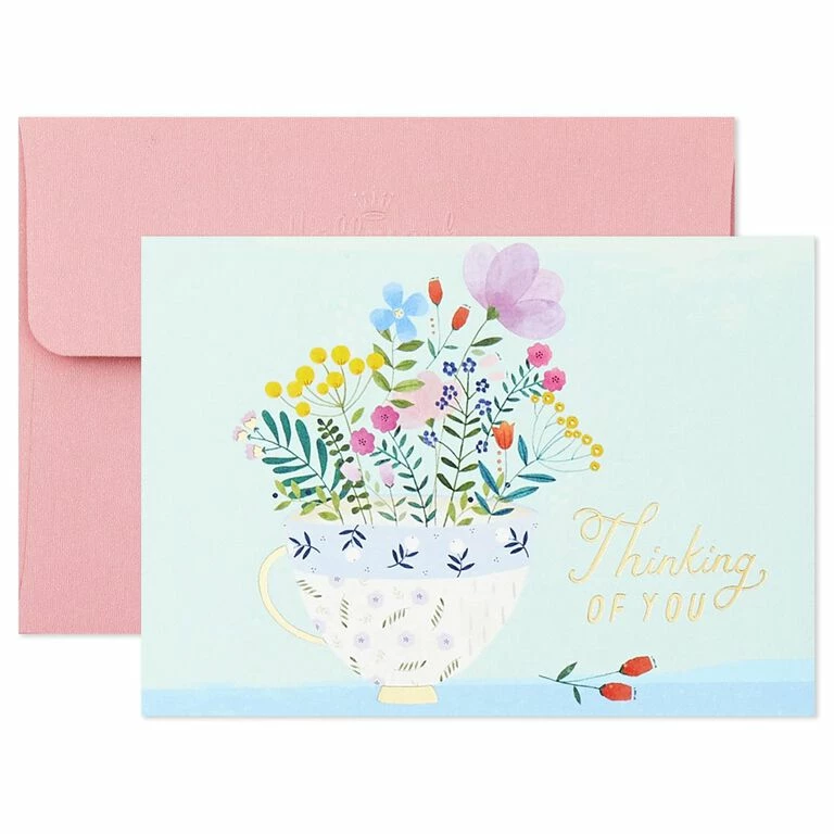 - Birthday cake cover message: Happy Day; Party banner cover message: Happy Birthday; Balloons cover message: (blank); Gold script on pink cover message: Thank You; Bird on branch cover message: Thank You; Floral wreath cover message: Thank You So Very Much; Teacup bouquet cover message: Thinking of You; Gold heart on green cover message: Good Vibes; Floral print cover message: (blank); Flowers in pitcher cover message: (blank).