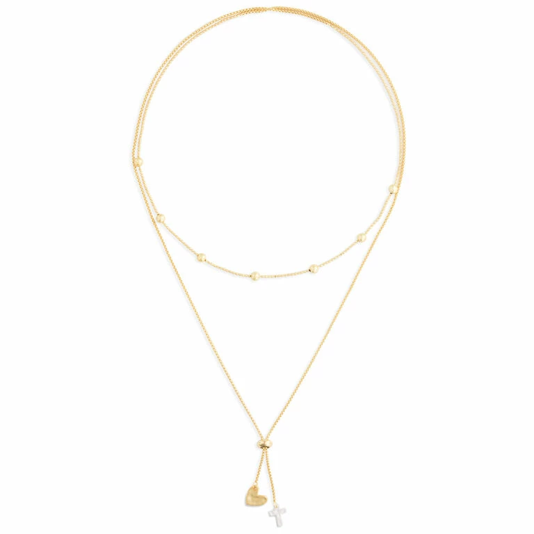 Faith and love, two of the things that matter most, are showcased in this pretty layered necklace that features a dangling gold metal heart charm and silver metal cross charm. Brass design with beaded shorter chain and adjustable-length charms make this piece of jewelry a beautiful way to accessorize your look. Gift packaged with a message that lets the recipient know how much they mean to you.