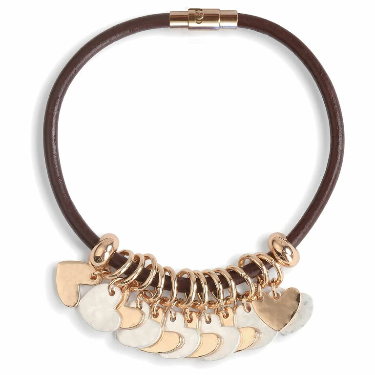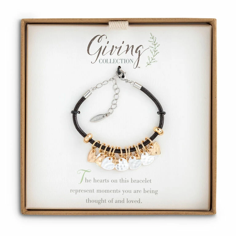 Give this thoughtful bracelet to someone special to let them know they’re thought of often and loved. Gold and silver metal charms dangle from the leather bracelet with a magnetic closure that makes it easy to wear. A heartfelt piece for any occasion in easy, ready-to-gift packaging.