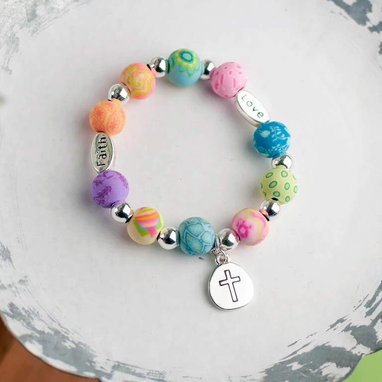 Help a little one celebrate her faith with this colorful beaded bracelet that comes packaged on a themed display card with special message. Bright patterned beads made from polymer clay pair with metal beads and metal charms imprinted with “faith,” “love” and a cross design on a strong elastic band. Stretch faith bracelet is perfect for girls ages six and up.