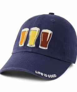 Show off your diversified portfolio—especially when it comes to beer—with this navy blue Life Is Good baseball cap. Featuring a trio of beer pints embroidered on the front panel, this comfy hat has an adjustable back closure with a snap for the perfect fit. Washed for softness, this dark blue cotton twill hat is sure to become a favorite at a ball game, pub crawl or campsite.