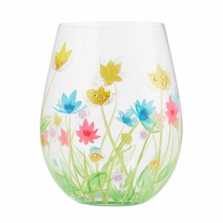 - Lolita handpainted stemless wine glass features a meadow of flowers in bright colors.