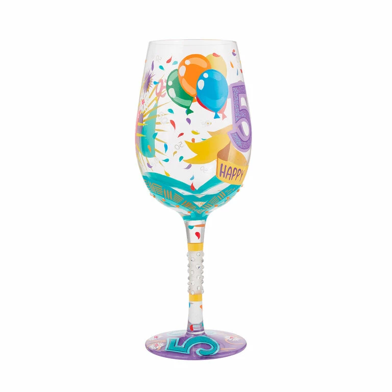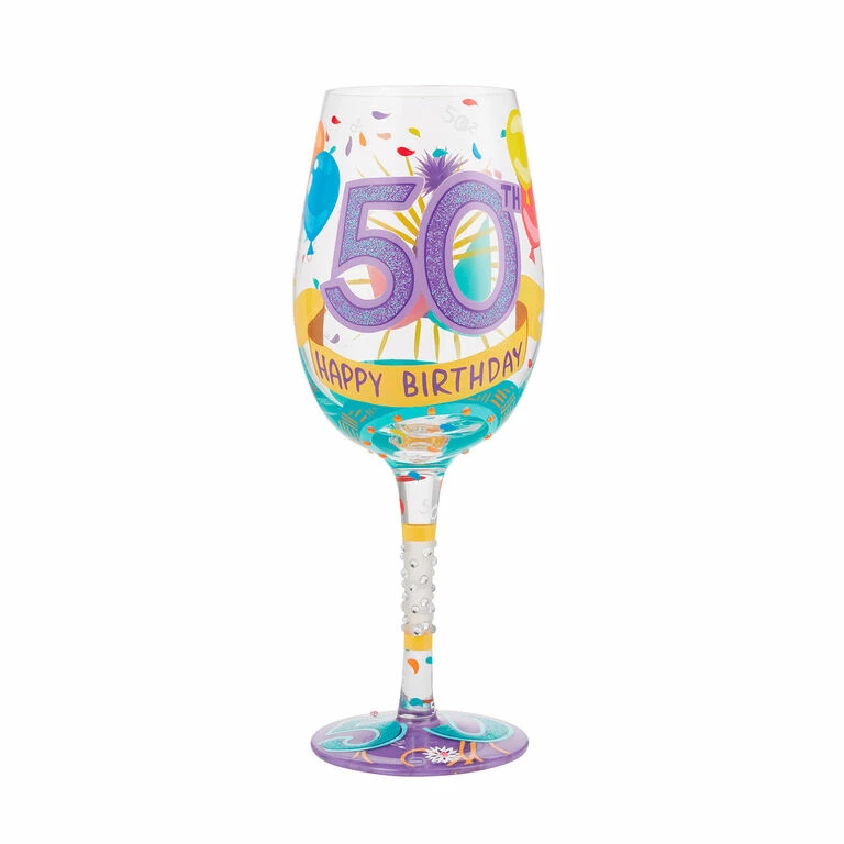 Celebrate turning 50 with a spectacle of color and fun. Covered in handpainted balloons and confetti, this 15-oz. wine glass sparkles with birthday charisma any day of the year. Capture their milestone with this stylish and festive gift from Lolita in its own signature gift box.