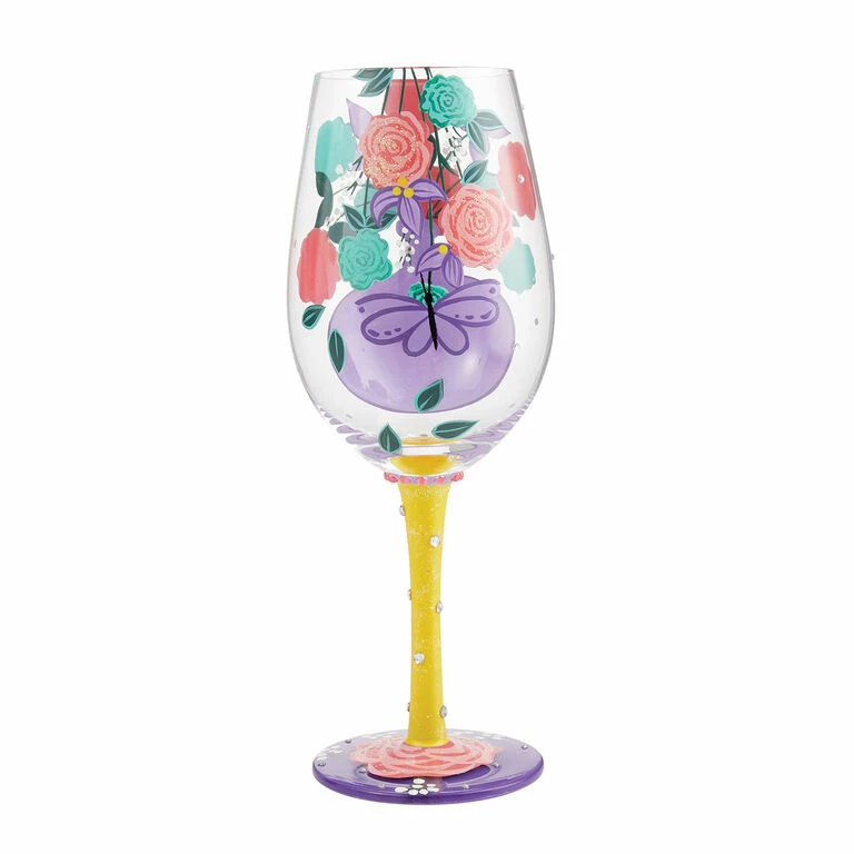 - Lolita handpainted wine glass features a bouquet of flowers, glitter and gems.