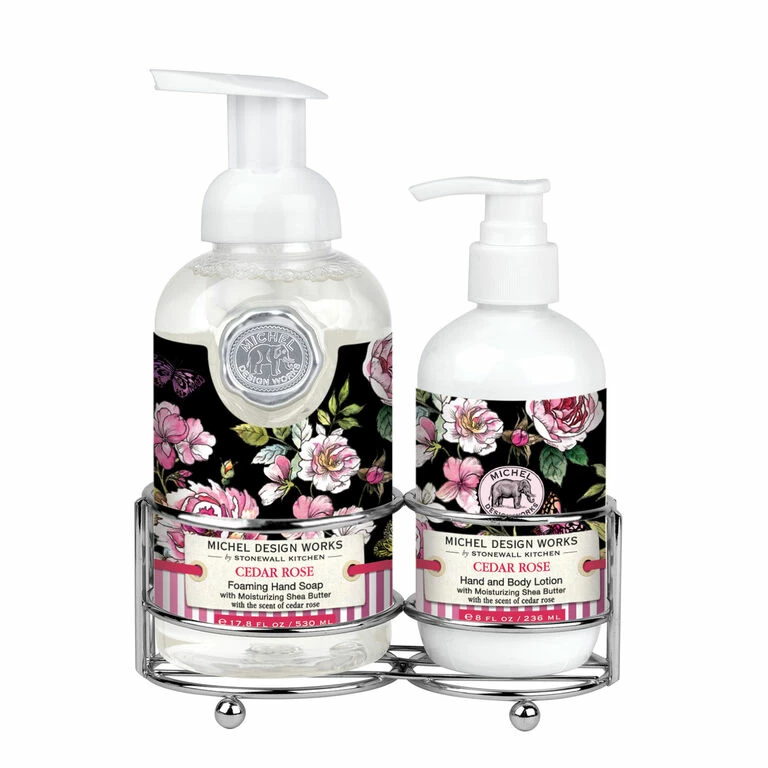 - Michel Design Works Cedar Rose set of foaming hand soap and lotion in a metal caddy.