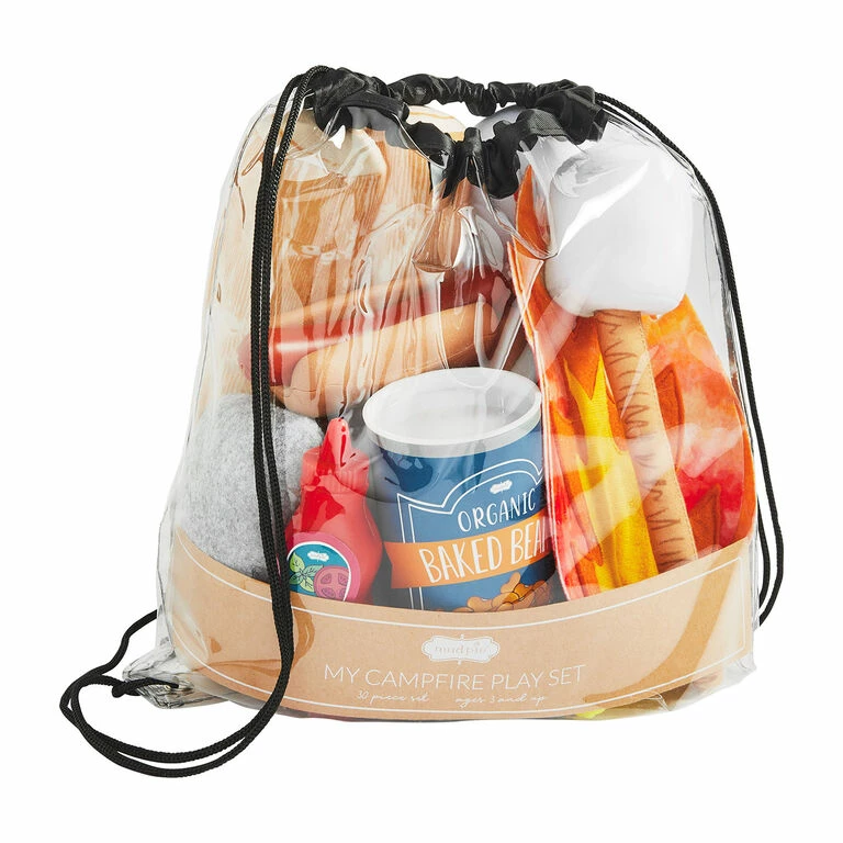 - Mud Pie plastic and fabric play campfire set features 30 toy pieces in a drawstring bag.