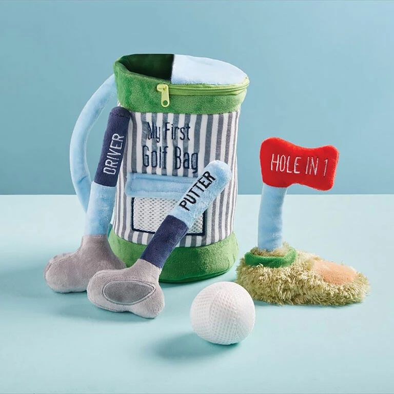 - Mud Pie plush fabric golf bag play set includes 4 accessories.