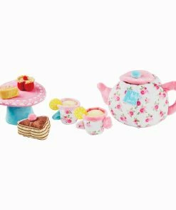 - Mud Pie plush cotton play tea set includes 7 interactive pieces.