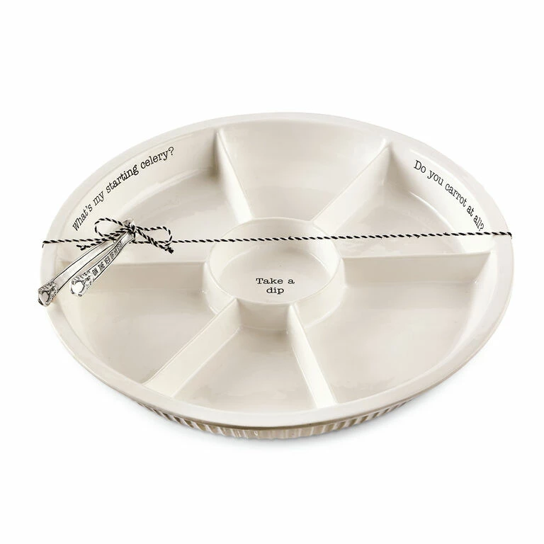 Invite guests to snack from this pretty white two-piece serving set. The fluted ceramic, multi-section veggie serving tray features funny debossed messages along the inner rim and a center dip well. Paired with silver-plated tongs, the set makes a great hostess or holiday gift.
