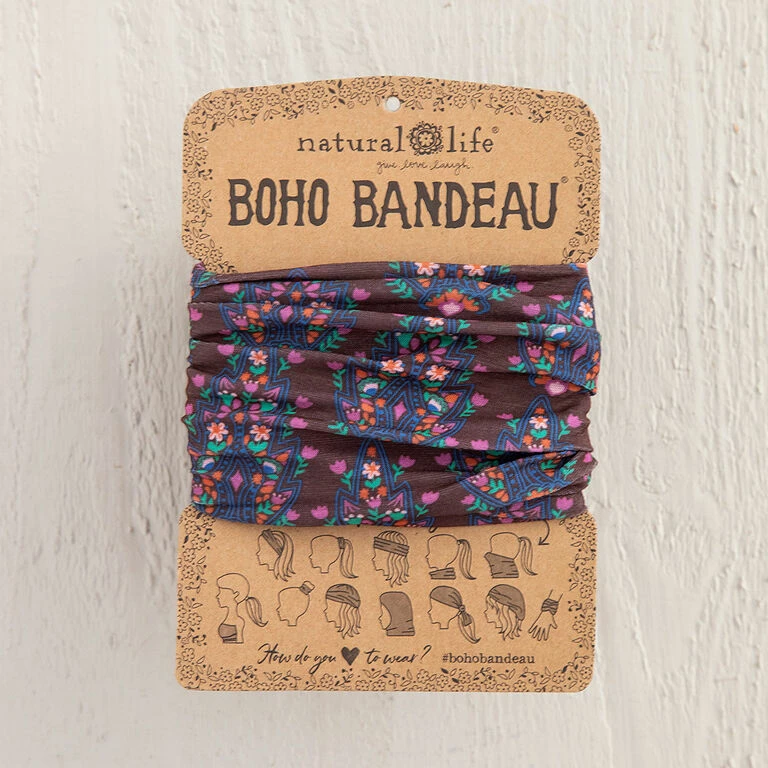- Natural Life 100% polyester Boho Bandeau headband features wearing ideas on package.