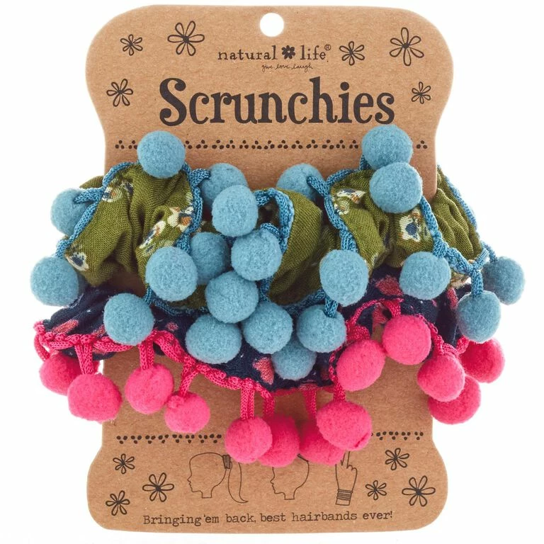 - Set of 2 Natural Life floral scrunchies feature turquoise blue and pink pom-pom trim.