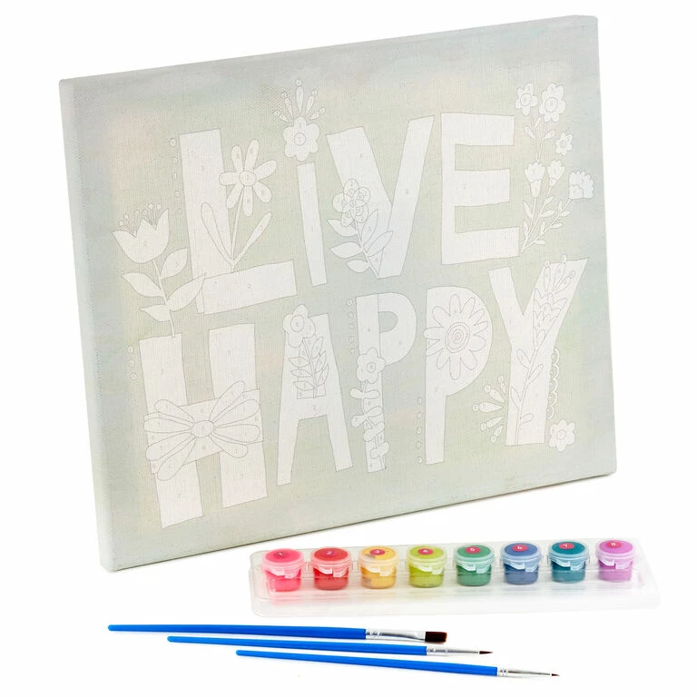 Decorate your home or office with this DIY paint-by-number canvas craft kit that includes everything you need to paint and hang a colorful “Live Happy” canvas. Let your creativity loose with 8 colors of paint and 3 brushes. Makes a great gift for friends or family of all ages who want to awaken their inner artist.
