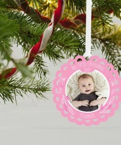 Hallmark Baby’s First Christmas Pink Scalloped Personalized Text And Photo Metal Ornament