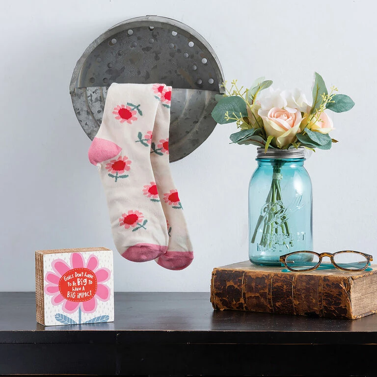 Add “goal-getter” to your personal repertoire with this painted wood quote sign packaged up with a cute pair of matching socks. Giftable box sign features a vibrant pink floral design and inspirational message, and the coordinating women’s crew socks feature the same all-over flower print. Box sign is easy to hang or can stand by itself for bookshelf or tabletop display. Socks come neatly rolled inside box sign and are secured with cotton ribbon.