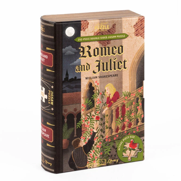 Take a trip to fair Verona when you work this Romeo and Juliet double-sided puzzle. Features the star-crossed lovers in the famous balcony scene from Shakespeare’s masterpiece on one side. Flip the puzzle pieces over for another challenge as you work the reverse side that features an excerpt from the play. 252-piece puzzle makes a great gift for book lovers and puzzlers alike!