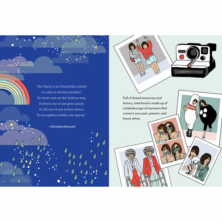 - “Sisters: Better Together” features illustrations and quotes celebrating sisterhood.