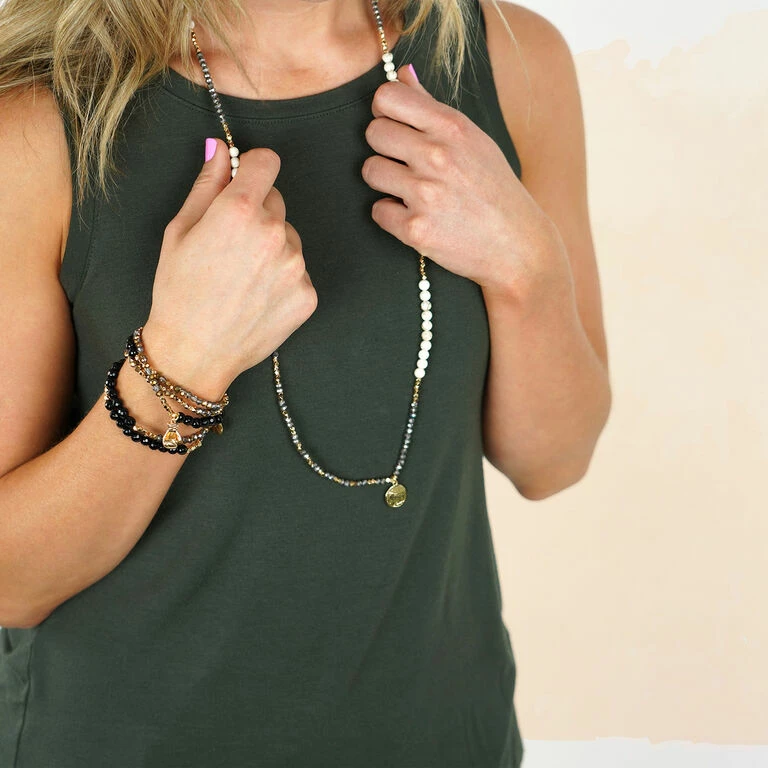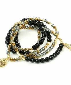 - Soul Stacks wrap bracelet/necklace features black agate semi-precious stones with metal beading and charms.