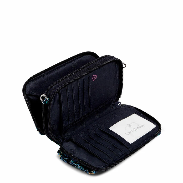 You wear many hats throughout the day so you need accessories that can adapt with your needs. Enter the Vera Bradley all-in-one crossbody bag in a black with blue paisley floral pattern made of quilted recycled cotton fabric. This small purse is a multifunctional must-have for a girl who is always on the go. With plenty of pockets and card slips, this organized wallet-turned-wristlet offers hands-free convenience, while RFID-blocking technology protects credit and debit cards from unwanted scans.